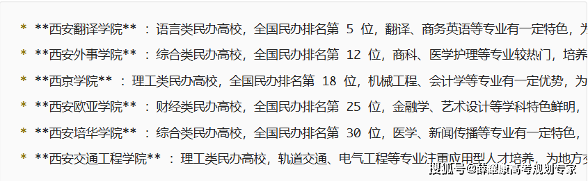西安交通大学、西北工业大学、西北农林科技大学、西安电子科技大学、西北大学、陕西师范大学、长安大学。这是陕西的几所985或211工程院校,实力摆正在那,因为陕西地处西北,所以分数线相对于沿海地域或经济强市要低一些,这也给大师报考陕西的院校供给了优良机遇,绝对是最佳选择。西安理工大学、西安邮电大学、西北大学、西安建建科技大学、陕西科技大学、西安科技大学、西安外国语大学。这些院校也都是老牌大学,实力雄厚、师资力量强大、硬件设备齐备,有浩繁的博士硕士授权点和国度特色专业及省级沉点学科,是你报考的抱负选择。西安石油大学、西安工业大学、西安财经大学、西安医学院、陕西西医药大学。这几所院校实力也相可不雅,师资力量强大,人才辈出,学校有双聘院士、出名学者、特级传授,有国度特色专业及省级沉点学科,是你肄业的优良选择。西安工程大学、延安大学、陕西理工大学、西安医学院、西安航空学院、西安美术学院、西安体育学院。这几所院校都是通俗本科院校,建校汗青长久、学风浓重,有浩繁的学位授权点和国度特色专业及省级沉点学科,正在此深制,你的将来不是梦。宝鸡文理学院、西安文理学院、榆林学院、咸阳师范学院、安康学院、渭南师范学院、商洛学院、陕前师范学院、西京学院、西安培华学院、西安交通大学城市学院、西安翻译学院、西安欧亚学院、西安思源学院、西安交通工程学院、西安科技大学高新学院、西安财经大学行知学院、陕西国际商贸学院、西安建建科技大学华清学院、延安大学西安立异学院、陕西服拆工程学院、西北工业大学北方消息工程学院、陕西科技大学镐京学院、西北工业大学明德学院、长安大学兴华学院、西安消息职业大学、西安外事学院、西北大学现代学院、西安理工大学高科学院。这些院校实力相对偏弱,但完全能够实现你读本科的胡想,只需你肯勤奋,考研就业都没有问题,你的将来会一片。西安交通大学:分析类名校,全国排名第 12 位,C9 联盟 / 双一流 / 985 高校,能源动力、机械工程等学科处于顶尖程度,为国度科研和人才培育做出了杰出贡献。西北工业大学:理工类名校,全国排名第 25 位,双一流 / 985 高校,航空宇航、材料科学等学科全国领先,是我国国防科技工业的主要人才培育。西安电子科技大学 :理工类高校,全国排名第 38 位,双一流 / 211 高校,消息取通信工程、计较机科学等学科实力强劲,正在电子消息范畴具有普遍影响力。西北农林科技大学:农林类高校,全国排名第 54 位,双一流 / 985 高校,农业科学、葡萄酒工程等学科特色明显,为我国农业和农村成长培育了大量专业人才。陕西师范大学:师范类高校,全国排名第 68 位,双一流 / 211 高校,教育学、中国言语文学等学科劣势较着,为处所根本教育输送了大量优良师资。长安大学:理工类高校,全国排名第 85 位,双一流 / 211 高校,交通运输工程、土木匠程等学科实力雄厚,为我邦交通范畴培育了大量专业人才。空军军医大学:医药类高校,全国排名第 90 位,211 高校,原第四军医大学,临床医学、口腔医学等学科处于顶尖程度,为我事医学和医疗卫生事业培育了大量专业人才。西北大学:分析类高校,全国排名第 64 位,具有双一流学科,考古学、地质学等学科正在全国名列前茅,为处所经济社会成长输送了大量复合型人才。西安建建科技大学:理工类高校,全国排名第 120 位,“建建老八校” 之一,土木匠程、城乡规划等学科特色明显,为建建行业培育了大量专业人才。西安理工大学:理工类高校,全国排名第 135 位,水利工程、印刷工程等学科劣势凸起,为处所制制业和工程手艺范畴输送了大量人才。陕西科技大学:理工类高校,全国排名第 150 位,轻工手艺取工程、皮革化学等学科有必然特色,为相关财产培育了大量专业手艺人才。西安邮电大学:理工类高校,全国排名第 180 位,消息取通信工程、收集平安等学科有必然劣势,为处所消息财产培育了大量人才。西安外国语大学:言语类高校,全国排名第 190 位,日语、为外事、经贸等范畴培育了大量外语人才。西安美术学院:艺术类高校,做为中国八大美院之一,美术学、设想学等学科实力强劲,为文化艺术财产培育了大量专业人才。西安音乐学院:艺术类高校,全国音乐类排名前五,正在音乐表演、做曲等范畴有必然影响力,为音乐艺术范畴培育了大量专业人才。西安石油大学:理工类高校,石油工程、地质资本等学科特色明显,为石油行业培育了大量专业手艺人才。西安工程大学:理工类高校,纺织工程、服拆设想等学科有必然劣势,为纺织服拆行业培育了大量专业人才。